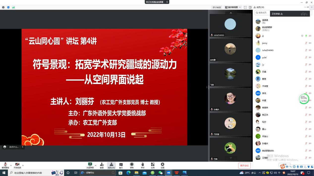 10月13日下午,学校统一战线“云山同心圆”讲坛第4讲在线上开讲,我校农工党党员、西语学院教授刘丽芬作主题为“符号景观:拓宽学术研究疆域的源动力——从空间界面说起”的线上讲座。讲座由农工党广外支部主委杨健生主持。