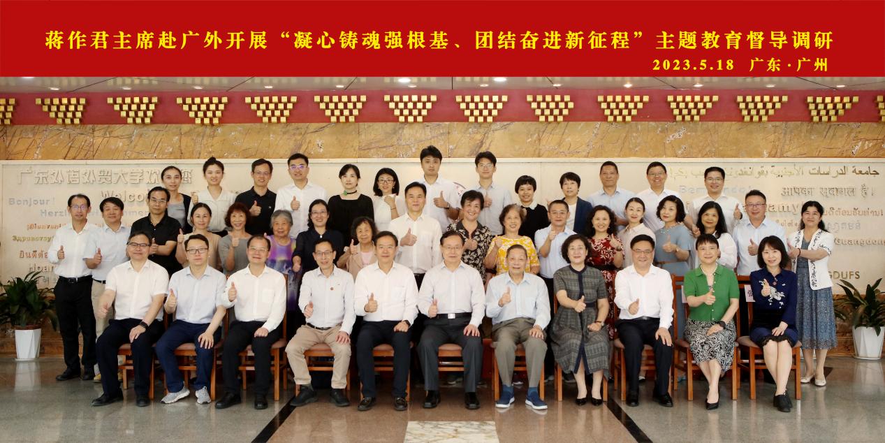 蒋作君一行到我校开展“凝心铸魂强根基、团结奋进新征程”主题教育督导调研并召开座谈会。在听取与会人员发言后,蒋作君对基层组织开展主题教育提出要求。他强调,要扎实开展主题教育,进一步加强基层组织思想政治建设。要在加强理论武装、筑牢思想根基,传承优良传统、增进政治共识,强化思想引导、凝聚团结力量上不断发力。要深入学习贯彻习近平新时代中国特色社会主义思想,以纪念中共中央发布“五一口号”75周年为契机,学习多党合作史、致公党史,把思想政治工作贯穿到自身建设和履职实践的各个环节,引领致公党党员更加深刻领悟“两个确立”的决定性意义,更加自觉增强“四个意识”、坚定“四个自信”、做到“两个维护”。蒋作君指出,要不断提升自身建设能力和水平,用基层组织建设成效检验主题教育成果。基层组织是主题教育的“最后一公里”,要切实落实以章治党、推进“书香支部”建设、强化人才队伍建设,提升基层组织活力、丰富基层组织生活、建立健全基层组织制度,促进主题教育走深走实、入脑入心。蒋作君强调,要不断提升参政履职效能,用基层组织履职成果为全党主题教育增光添彩。致公党广外总支一方面要发挥侨海特色,积极参政履职,结合广东外语外贸大学的专业优势和鲜明特色,不断加强“做好侨海大文章”能力建设,围绕中共广东省委工作部署建言献策。另一方面,要做好本职工作,提升履职成效,高校教师要围绕本职工作,充分发挥人才智力优势,结合自身特长优势及实际情况,不断拓宽履职渠道、丰富履职内容,积极参政履职。