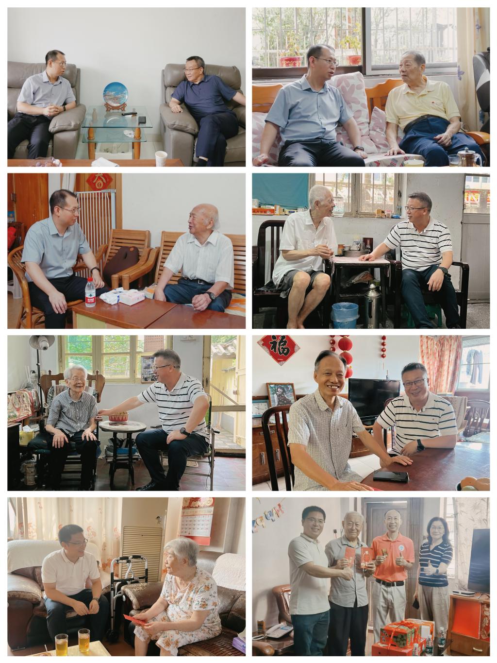 慰问组一行分别走访了缅甸归侨龚华基、省政府参事顾也力、台属郭晓青、吴婉玉,党外教授蔡型乞等统一战线老同志代表,关切询问他们的生活和身体状况,认真倾听他们对学校事业发展的建议。