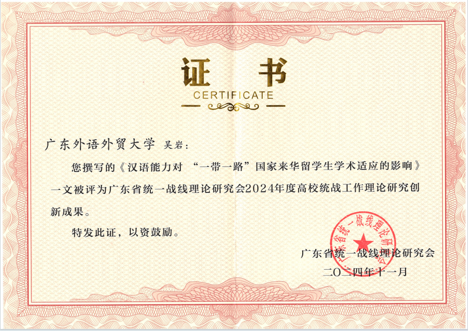 会议对广东省统一战线理论研究会过去一年的工作进行了总结,对统战理论研究创新成果进行表彰。今年全省共收到各高校报送论文总数达386篇,获得创新成果奖50篇,其中我校有2篇研究论文荣获“广东省统一战线理论研究会2024年度高校统战工作理论研究创新成果奖”。