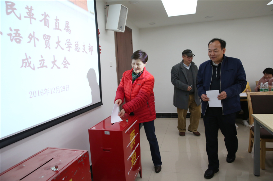 在成立大会之前,民革广外总支部按照民革章程有关规定进行了投票选举。刘小平代表原民革支部做了总支部筹备工作报告。民革广外总支部现有党员37人,下设三个支部:第一支部、第二支部、第三支部。选举结果为:刘小平当选为民革省直属广东外语外贸大学总支部主委,陈龙江、张效珍当选为总支部副主委;刘小平、陈龙江、张效珍、刘毅、牛瑞英、陈震红、林丹青、卢巧云当选为总支部委员;陈龙江当选为第一支部主委,陈龙江、刘芳华、邱玲当选为第一支部委员;张效珍当选为第二支部主委,张效珍、陈震红、曾晓杰当选为第二支部委员;刘毅当选为第三支部主委,刘毅、李丽人、张小藩当选第三支部委员。