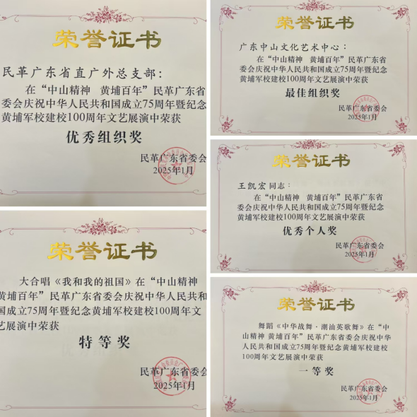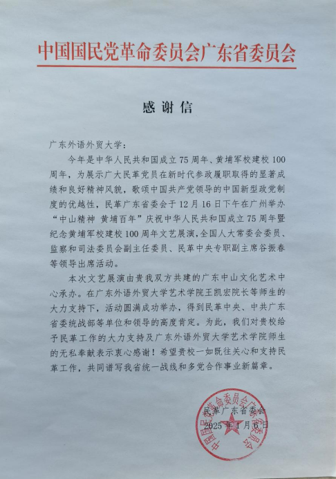 此外,会议还表彰了在庆祝中华人民共和国成立75周年暨纪念黄埔军校建校100周年文艺展演中表现突出的组织和个人:我校民革总支获优秀组织奖;民革省委会与我校共建的广东中山文化艺术中心获最佳组织奖;王凯宏同志获优秀个人奖;我校民革总支选送、民革党员熊岳巍指挥的大合唱《我和我的祖国》、舞蹈《中华战舞•潮汕英歌舞》分别获特等奖和一等奖。由于表现突出,民革省委会特向学校发来感谢信,以感谢我校师生在文艺展演中的无私奉献和大力支持。