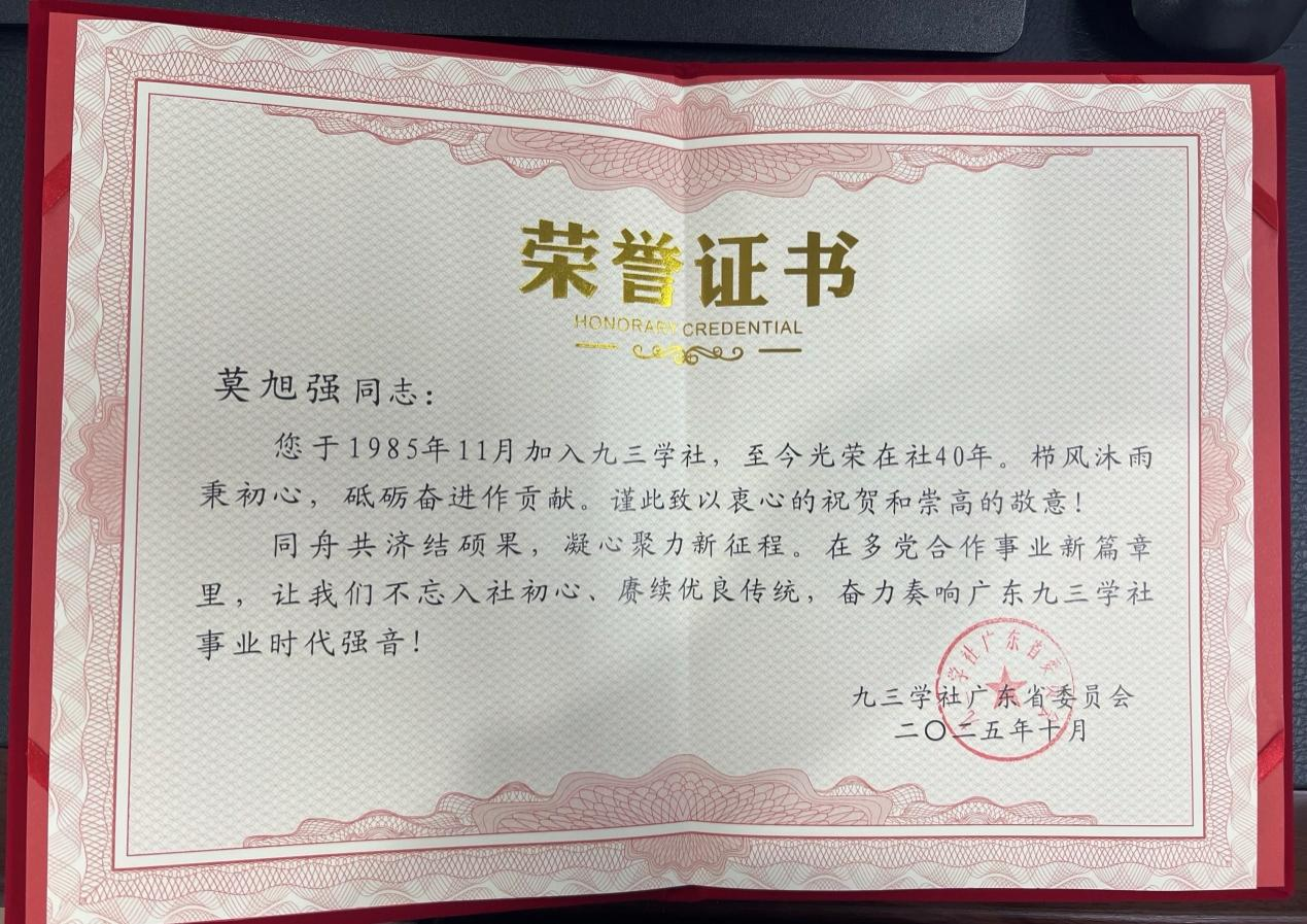 为弘扬中华民族尊老敬老美德,向为学社和学校发展作出贡献的离退休社员表达敬意。重阳节之际,我校九三学社基层委以“以尊老敬贤为基,共谋广东高质量”为主题组织茶话会。原全国政协委员、九三学社广东省委原副主委顾也力,广东省人民政府参事室特约研究员、广东省政协咨询委员会委员王卫红等十余名社员参加会议。社省委组织处处长李沈玲出席了茶话会。莫旭强老主委获得社省委颁发的“光荣在社40年”荣誉证书。